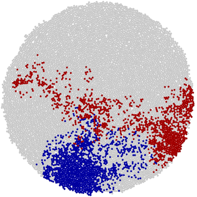 Computer simulation showing how cells sharing the same type of mutation can either group closely together in one area of the tumour (shown in blue) or be spread out across different parts of the tumour (shown in red).