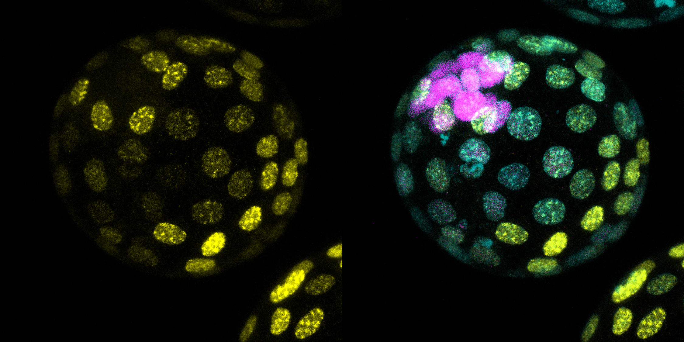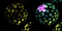 Left: a 64-cell mouse embryo showing CEBPa expression in the nuclei of cells (in yellow), coinciding with the trophectoderm, the outer layer that will eventually form the placenta. Right: image merged with the embryo stained for OCT4 expression (in pink) to indicate the future adult body, and for DNA (in blue/green). Credit: Marcos Plana-Carmona, Centre for Genomic Regulation