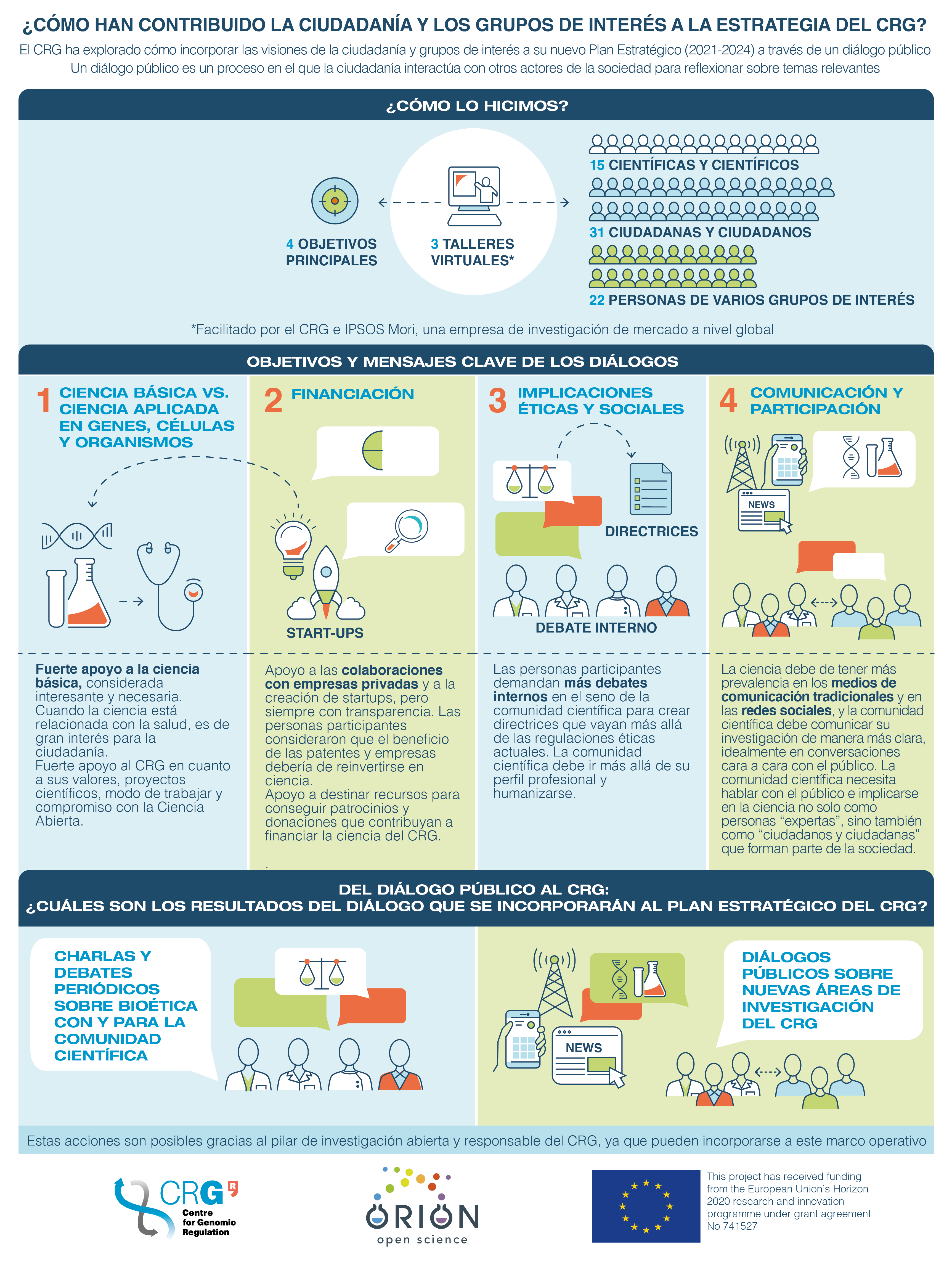 Con el fin de comprender las prioridades del público para continuar llevando a cabo investigación fundamental y, a la vez, desarrollar aplicaciones prácticas en genómica y biología fundamental para la salud humana, y los aspectos éticos y la financiación de dicha investigación, el CRG colaboró con Ipsos, una empresa líder global en investigación de mercados, para poner en marcha un diálogo público con personas de toda España. Un diálogo público es un proceso durante el cual miembros del público interactúan con científicas y científicos, grupos de interés (como, por ejemplo, organizaciones que financian la investigación, empresas y políticos) para deliberar sobre temas relevantes para futuras decisiones políticas.