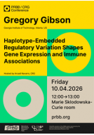 10/04/202612:00MARIE CURIEPRBB-CRG SessionsGregory GibsonGeorgia Institute of Technology"Haplotype-Embedded Regulatory Variation Shapes Gene Expression and Immune Associations"Host: Arcadi NavarroAbstract:The regulation of gene expression is typically mediated by multiple independent associations each parsimoniously assumed to be due to the activity of a single causal variant. In this talk I will challenge this assumption by reporting results of experiments using expression CROPseq to fine-map regulatory potential for 4,382 SNPs in 87 loci associated with immune disease. An average of 2.3 variants contribute to each of 66 fine-mapped eQTL, with some cell-state...